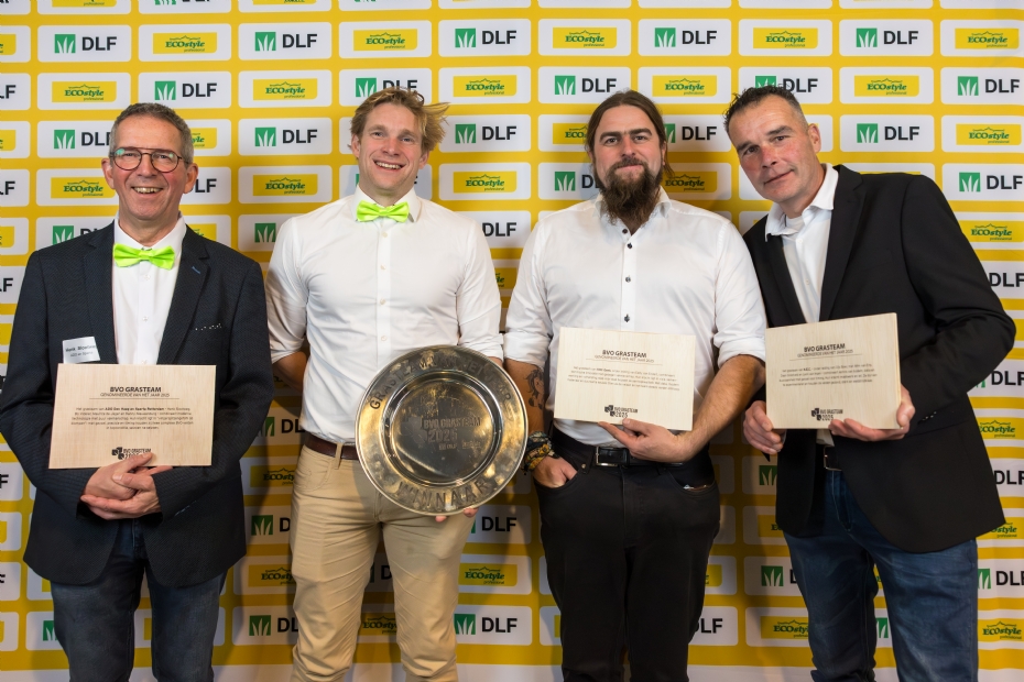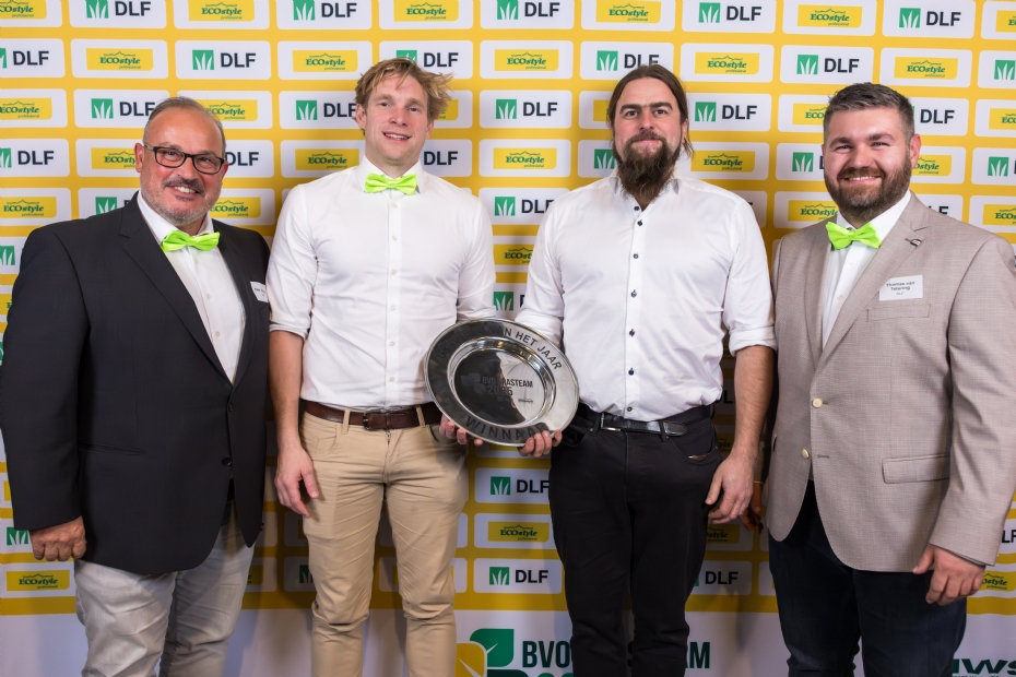 Peter Bartels (l) en Tomas van Tetering (r) van DLF met Fieldmanager of the Year René Kamstra (midden).
