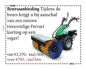Speciale aanbieding Tijdens De Groene Sector vakbeurs hebben we deze keer een speciale aanbieding. Als u een tweewielige Ferrari koopt, krijgt u korting op een veger! Deze veger kost normaal 1370 euro excl btw, maar speciaal tijdens deze beurs kunt u hem kopen voor maar 795 euro excl btw. Lozeman is te vinden op stand 620.