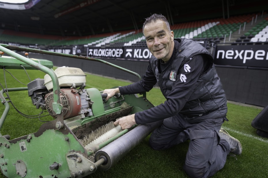 |  |  | 'Een volle grasmat oogt perfect, maar voor optimale grip is juist contact met de bodem cruciaal' |  |  |  |  |  TeamworkBoer doet het niet alleen. Zijn team is cruciaal. 's Ochtends werken Wim van Erp, Daan Grootveld en Leon van Ingen mee in het fieldmanagement, 's middags zijn ze verantwoordelijk voor het onderhoud van het stadion en trainingscomplex. 'Rick van Beuningen, de facilitair manager, Bob Stevens van de technische dienst en onze vrijwilligers springen soms bij.'Boer ziet het team breder dan alleen de fieldmanagers. Ook de stadiondirecteur, facilitair manager, trainersassistenten en vrijwilligers spelen een rol. 'Om tot een succesvol resultaat te komen, is het essentieel dat iedereen weet wat je doet en waarom. Wat dat betreft, is N.E.C. één grote familie.'